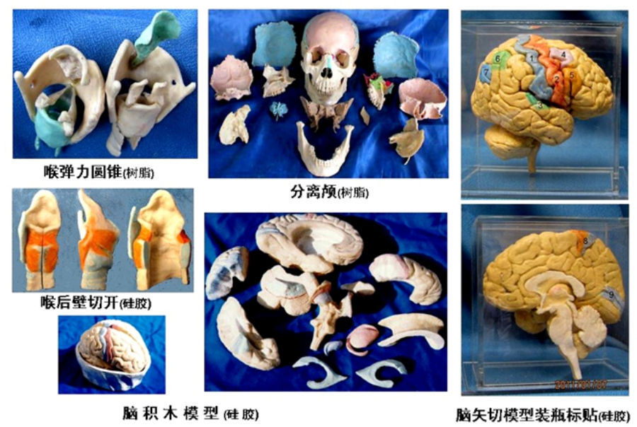 用正常和病态标本直接翻模,硅胶或软性环氧树脂成型着色,方便拼拆或演练神经血管行程,利于构建三维形象。软性模型如喉后壁纵切等,既看外形也可掰看内景,胜于价高质硬的塑化标本。对解决难点结构例如弹性圆锥、脑、颅等特别有效。