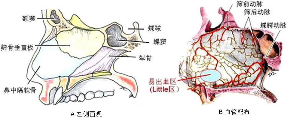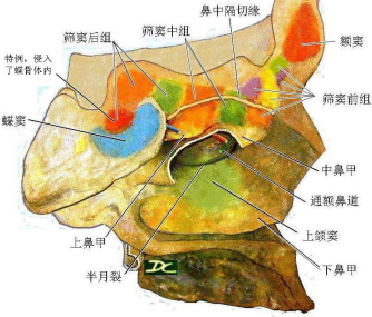 图2-3-2鼻中隔 鼻腔其余部分称固有鼻腔,表面衬以鼻黏膜,具有湿润、温暖空气的功能。固有鼻腔外侧壁上有上、中、下鼻甲nasal conchae,各鼻甲所覆盖的空间分别名上、中、下鼻道nasal meatuses(图2-3-3)。上鼻甲后上方的空间名蝶筛隐窝。鼻中隔两侧的鼻腔名总鼻道。鼻黏膜按生理功能分为嗅区和鼻呼吸区。 嗅区指上鼻甲表面及其相对的鼻中隔表面的黏膜,内含嗅细胞。其余的黏膜富含黏液腺、纤毛和血管。