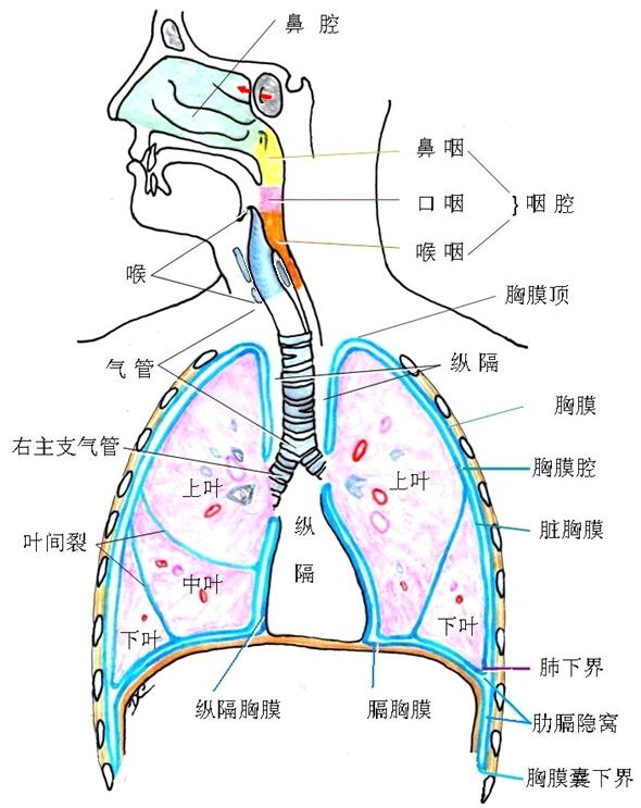 来源:董炘解剖网网址:http://www.jiepouedu.com 第三章 呼吸系统 呼吸系统respiratory system由呼吸道和肺组成(图2-3-1)。呼吸系统功能的发现史,是表明事物的发展遵循否定之否定规律的典型事例。发展并非一连串的否定扬弃,其基础是继承。发展似乎回到原点,实为到了螺旋的更高层。呼吸功能古老的说法是吸天地之“灵气”,入左心,通过“中空的”动脉管扩布全身。物理学发展认识到作功产热的原理后,人们认为包围心脏的肺是个散热装置,因为心跳产生大量的热,若不排除,小时后局部就会燃烧起来。随着血液循环学说确立和生化技术的进步,人们证实呼吸系统吸的“灵气”是氧气。氧气的发现是对灵气的否定,但却是对气的肯定。后来发现呼出碳酸气的作用,对气的认识进到更全面阶段。发烧时气促,散热说也非全错。这认识过程生动地体现了事物的发展是继承(肯定)和否定(扬弃)不断进行而螺旋上升的过程。否定是在继承的前提下发生的。否定之否定规律的精髓在于说明事物发展中继承和扬弃的辩证关系。如果违反了,就象只强调矛盾(斗争)不知目的是统一(和谐发展)那样,对事物的发展起阻碍作用。 单细胞直接靠体表进行交换,后来多细胞在特定地方的表皮特化并扩大面积,水生动物向外突出成腮,陆生动物向内陷入成呼吸管。呼吸管的末端经反复分叉,扩大气体交换面积而发展成肺。经推算,人体肺泡总