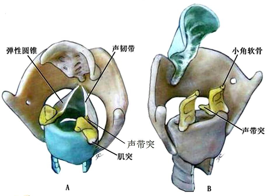 图2-3-6 喉的软骨及其连结 (2)环状软骨coricoid cartilage 形如戒指,前窄名弓后宽名板。是呼吸道**完整的软骨环。环下缘藉纤维与气管软骨相接。 (3)会厌软骨epiglottic cartilage 形似树叶,下端附于甲状软骨前角沟下份。构成喉口laryngeal apertured的前壁。 (4)杓状软骨arytenoid cartilage成对,有三突。前突名声带突vocal process。 外侧突圆钝名肌突muscular process,其底部有关节凹坐于环状软骨板上缘侧部的关节嵴上,构成环杓关节coricoarytenoid joint, 让杓状软骨绕垂直轴旋内,双侧声带突尖即相互靠近让声带振动发声;又可让两杓状软骨相互向中线靠贴裂的开闭运动。靠向中线然后复位的滑动。 (5)弹性圆锥conus elasticus(图2-3-6,7,8), 又名环甲韧带coricothyroid lig.,以甲状软骨前角后面下份为总起点,弹力纤维呈放射状向下依次 图2-3-7 喉软骨诸面观 向后附至环状软骨弓的上缘;向后附至两杓状软骨的肌突和前突,构成一个圆锥形帐篷,两游离边缘名声韧带vocal lig.。三角形的裂隙总称声门裂glottal fissure,分声韧带部和软骨部(图2-3-8),随生理要求而开闭。甲状软骨前角下缘与相对的环状软骨弓上缘之间的弹力纤维明显增厚名环甲正中韧带median coricothyroid lig.。