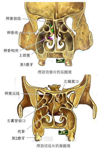 图2-3-3右侧鼻腔外侧壁 (三) 鼻旁窦paranasal sinus 成对地位于鼻腔的左右, 由骨性鼻旁窦内衬鼻黏膜构成,包括上颌窦、筛窦、额窦和蝶窦(图2-3-4A.B.C),均开口于鼻腔。病变时想把药滴入窦内或让脓液排出,须有适当的头位 1、额窦 于眉弓深面,从出现先后看实为筛窦向上的扩展。向下内通过筛窦开口于中鼻道。 2、筛窦 止位于筛骨内,由相邻的额、泪、颚、蝶诸骨贴合助成,毎侧一列多达十余可互通的筛房cell,就近向下开口于上鼻道或中鼻道。 3、蝶窦 于蝶骨体内,多左右各一,口朝前,开口于蝶筛隐窝。蝶窦口高于窦底。 4、上颌窦 于上颌骨体内,可侵入颧骨,容积近15ml,窦底低于鼻腔。有时磨牙根突入窦底,只黏膜相隔,龋磨牙可致上颌窦炎。开口于中鼻道。
