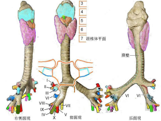图2-3-16 肺纵隔面 肺下界的位置(图2-3-16)随呼吸而变动,变动幅度直接反映肺的功能情况。在平静呼吸时,双侧肺下界的体表投影可用三点标示:前在锁骨中线与第6肋交点处,侧方在腋中线与第8肋交点处,后在肩胛线与第10肋交点处。可在病人身上通过叩诊确定,然后令病人尽量深呼气后屏住呼吸,在腋中线上叩出肺下界的上升度,再叩出深吸气后的下降度。正常升降均为3~4cm,即变动幅度可达两个椎体的高度。若变动幅度减小,可作肺功能低下或病变的依据。 二、肺内支气管和肺段 左、右主支气管入肺门后分为叶支气管。叶支气管再分为段支气管,再经多次分支,构成支气管树。一个肺段支气管及其所属的肺组织一起称为肺段pulmonary segment。双侧肺各有10个肺段(图2-3-17)。各肺段呈锥体形,尖朝向肺门,底构成肺的表面。各肺段的名称见下表。肺的病变采用肺段切除术,可减少健康肺组织被切和减少出血。熟悉肺段支气管的走向,才能成功地作肺段内脓、痰液的体位引流。